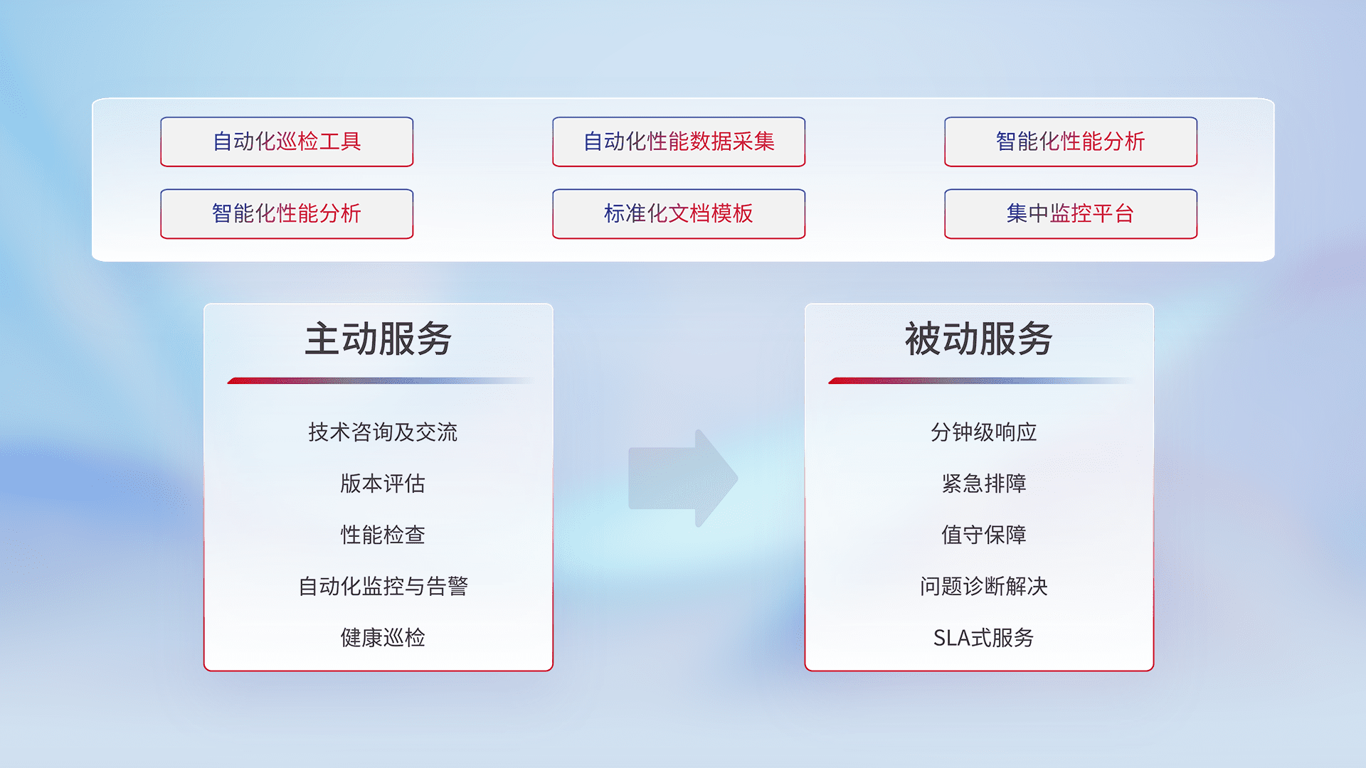 智能化工具和标准化文档,,保障服务质量,,,提供主动服务(包含技术咨询、、版本评估、、性能检查、、、、自动化监控与告警、、健康巡检)和被动服务包含(分钟级响应、、、、紧急排障、、值守保障、、、问题诊断解决、、、SLA服务)。。
