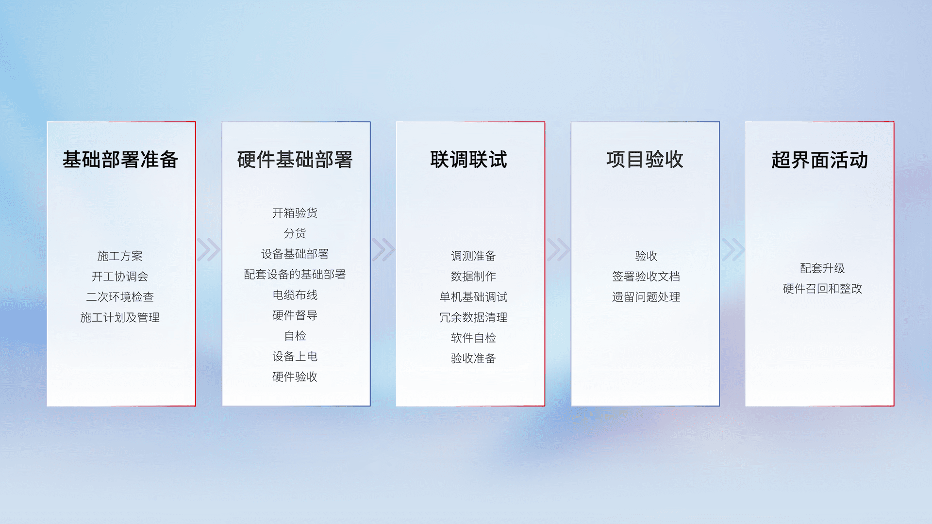 从基础部署准备、、、、硬件基础部署、、、联调联试、、、、项目验收、、越界面活动的全过程可追溯,,,保证施工质量和进度。。。